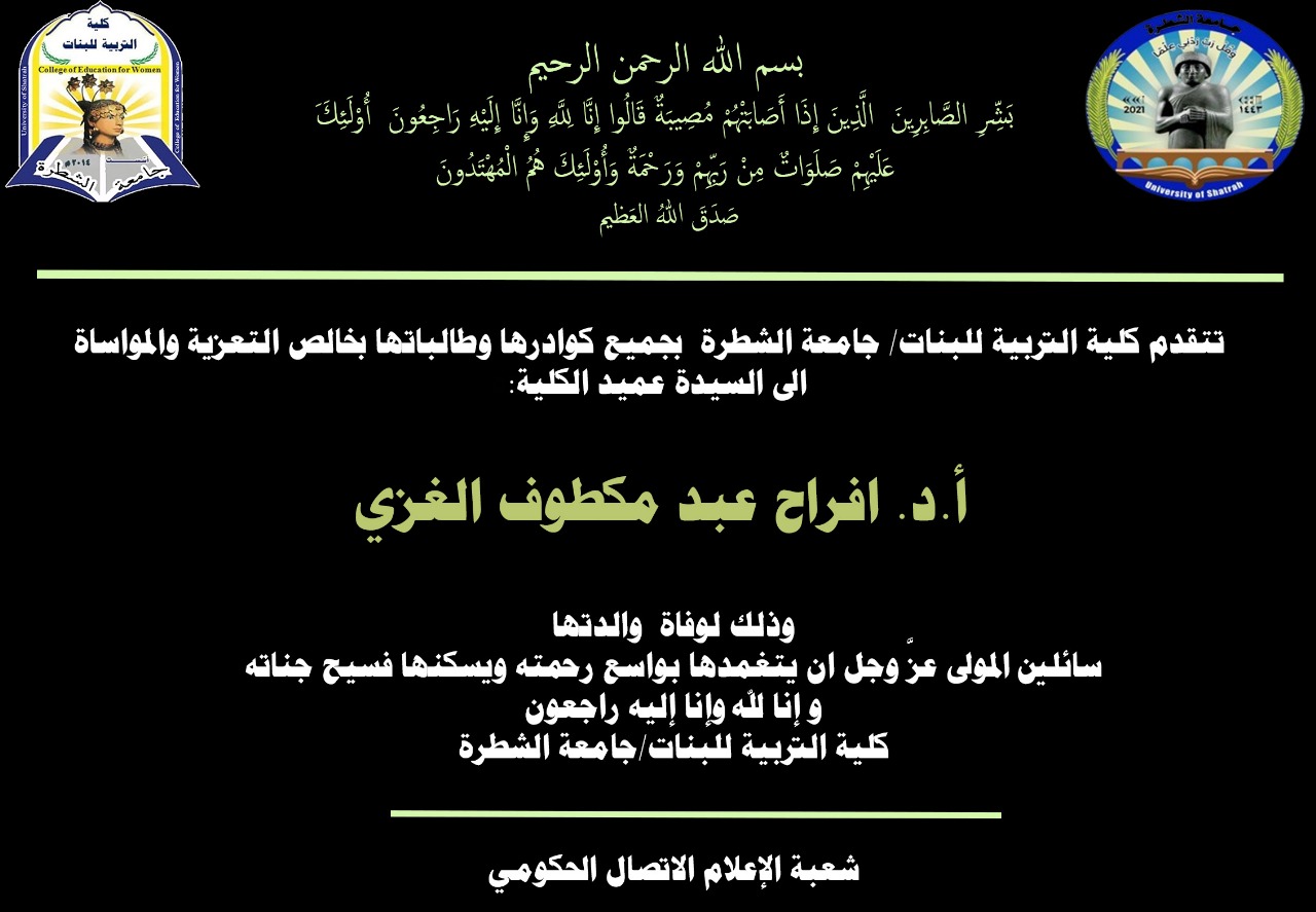 تتقدم كلية التربية للبنات/ جامعة الشطرة بجميع كوادرها وطالباتها بخالص التعزية والمواساة الى السيدة عميد الكلية ا.د. افراح عبد مكطوف الغزي وذلك لوفاة والدتها .