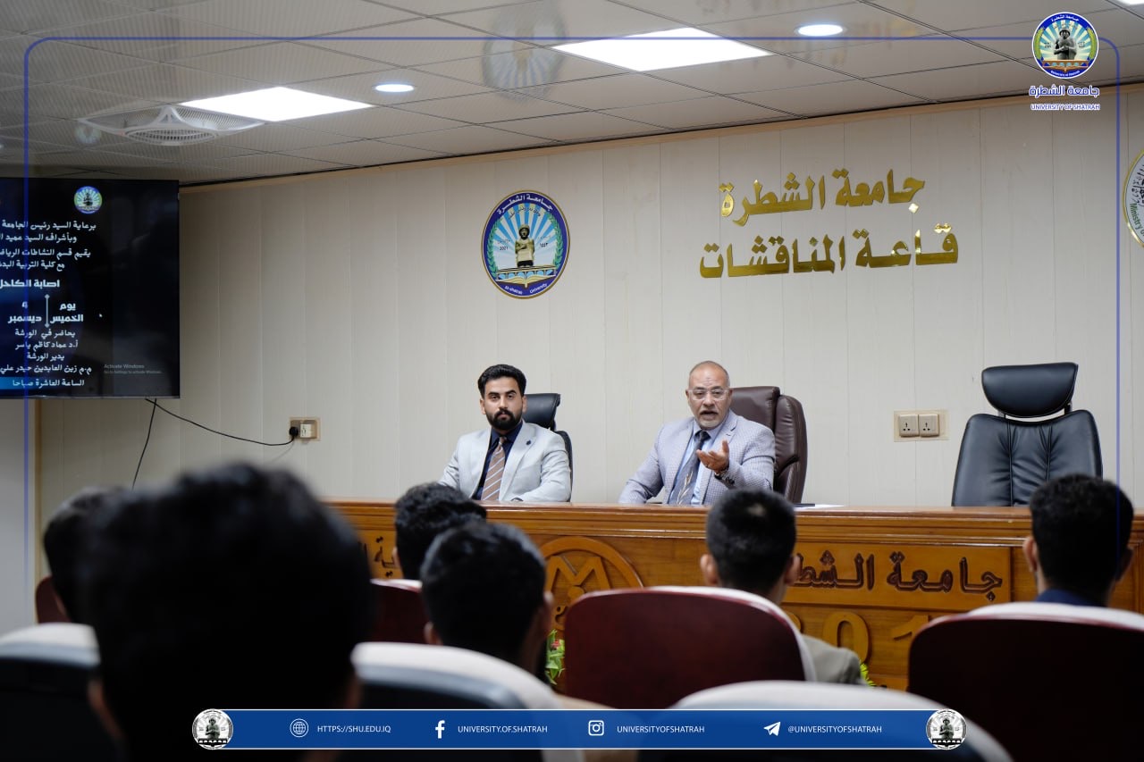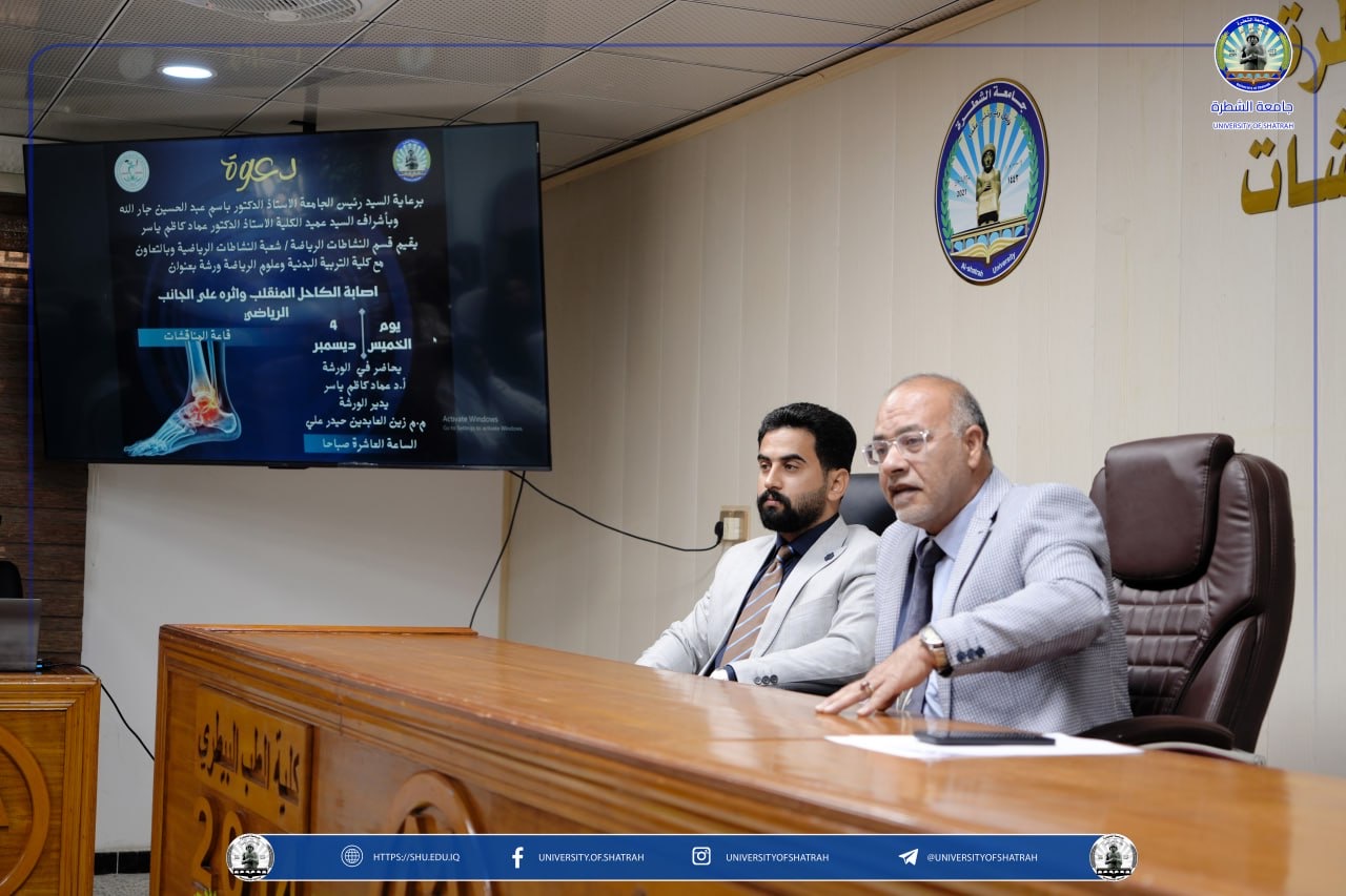 برعاية رئيس جامعة الشطرة الأستاذ الدكتور باسم عبد الحسين جار الله المحترم ، نظم قسم النشاطات الطلابية – شعبة النشاطات الرياضية، وبالتعاون مع كلية التربية البدنية وعلوم الرياضة، ورشة عمل بعنوان إصابة الكاحل المنقلب وأثرها على الجانب الرياضي، اليوم الخميس  4 كانون الأول 2025 على قاعة المناقشات.