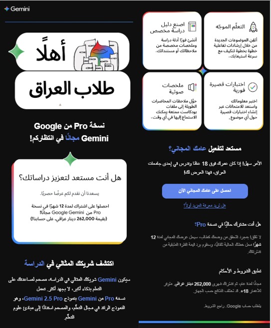 تتيح هذه المبادرة اشتراكاً مجانياً بالكامل لمدة 12 شهراً في النسخة المتقدمة من Google Gemini Pro، والتي تبلغ قيمتها (262,000 دينار عراقي)، ليكون هذا المساعد الذكي شريككم المثالي في الدراسة من خلال المزايا التالية: