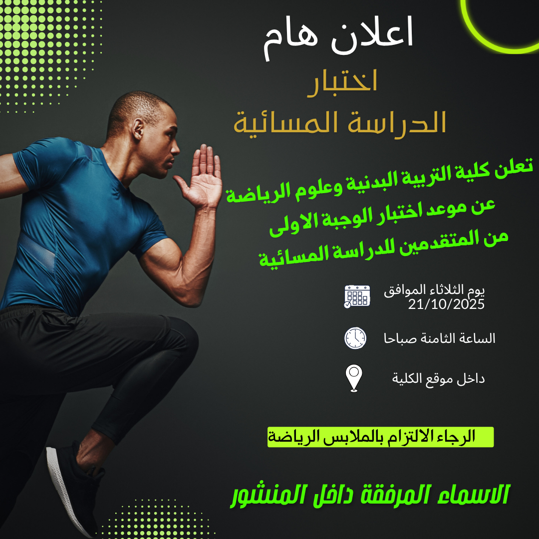 علنت كلية التربية البدنية وعلوم الرياضة عن تحديد اسماء والموعد الرسمي لإجراء اختبارات الوجبة الأولى لطلبة الدراسة المسائية المقبولين لديها.