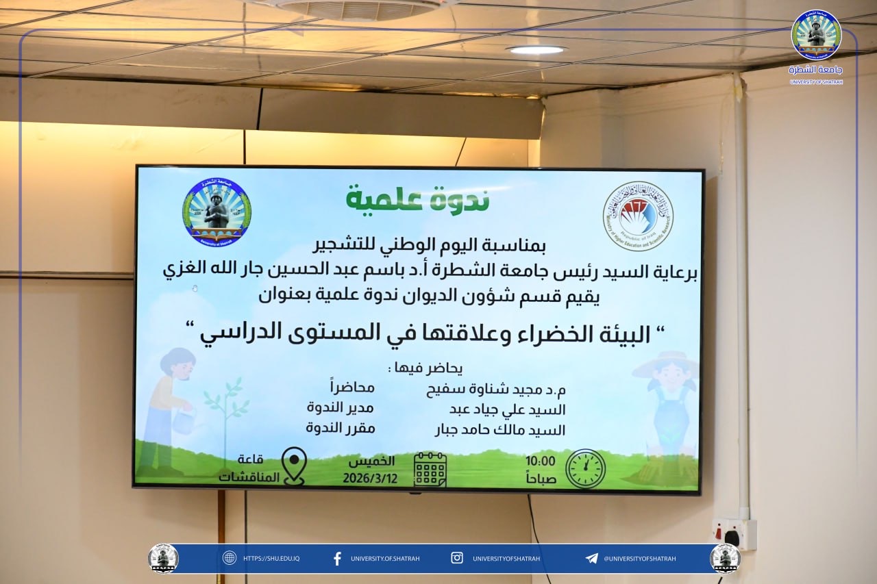 برعاية السيد رئيس جامعة الشطرة الأستاذ الدكتور باسم عبد الحسين جارالله الغزي واستنادًا لتوجيهات وزارة التعليم العالي والبحث العلمي نظّم قسم شؤون الديوان في رئاسة الجامعة حملة تشجير واسعة في حدائق الجامعة فضلاً عن ندوة علمية بعنوان " البيئة الخضراء وعلاقتها في المستوى الدراسي " يوم الخميس 12 آذار 2026، بمناسبة اليوم الوطني للتشجير.