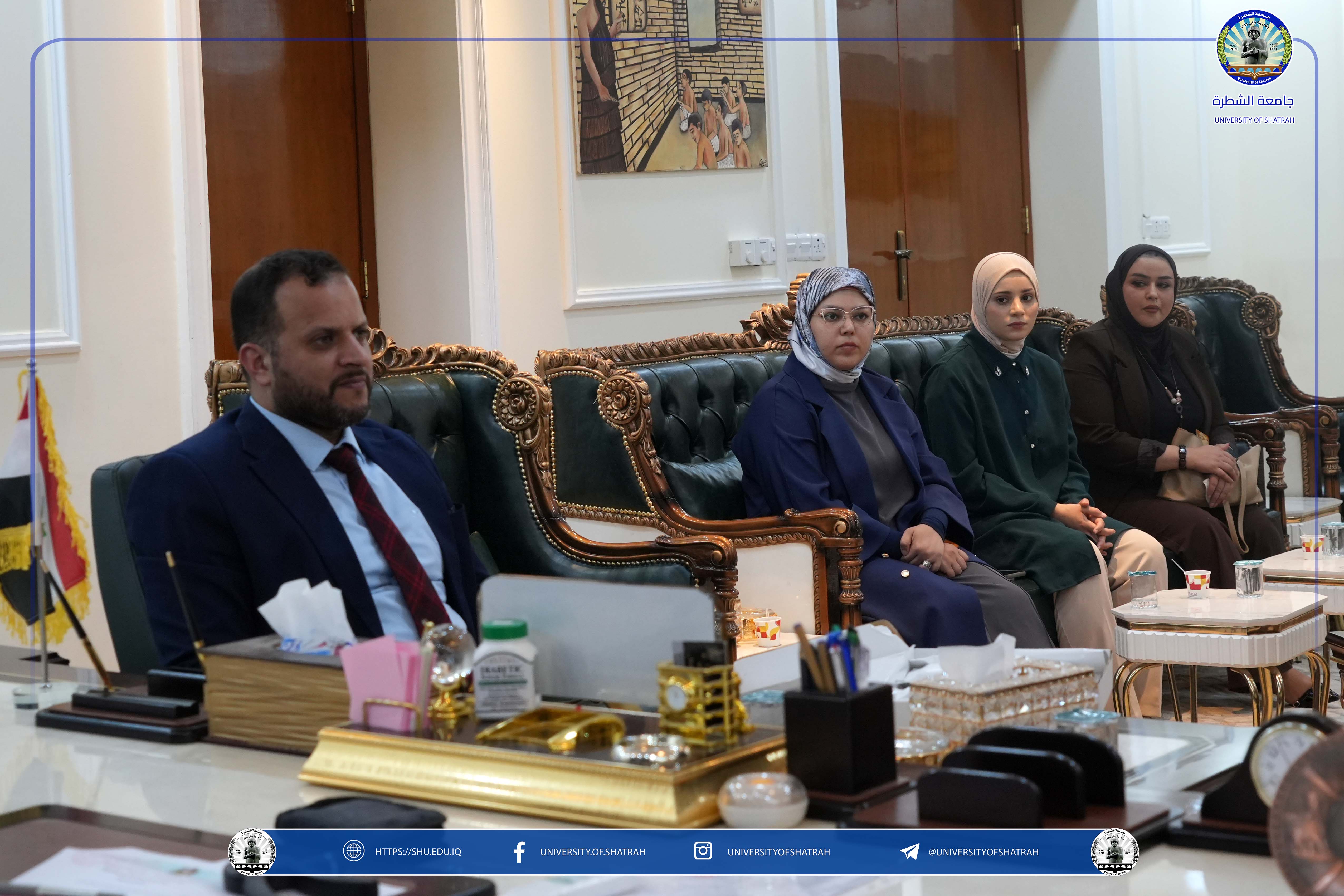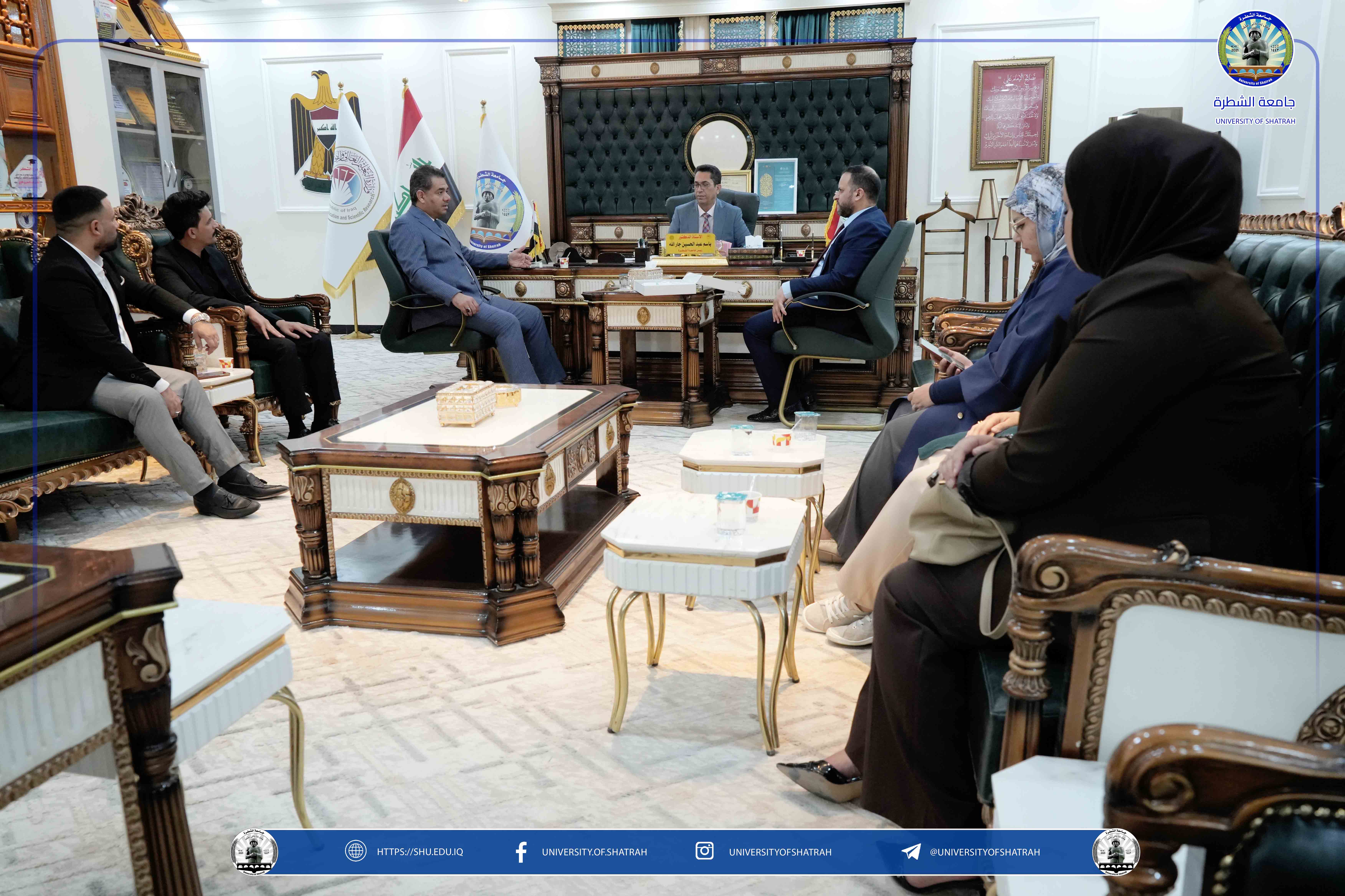 استقبل رئيس جامعة الشطرة الأستاذ الدكتور باسم عبد الحسين جار الله وفداً من جهاز الأمن الوطني ومفوضية حقوق الإنسان، وذلك على هامش الاحتفال المركزي الذي أقامته الجامعة بمناسبة اليوم الوطني العراقي يوم الخميس الخميس 2 تشرين الأول 2025 في مكتبه