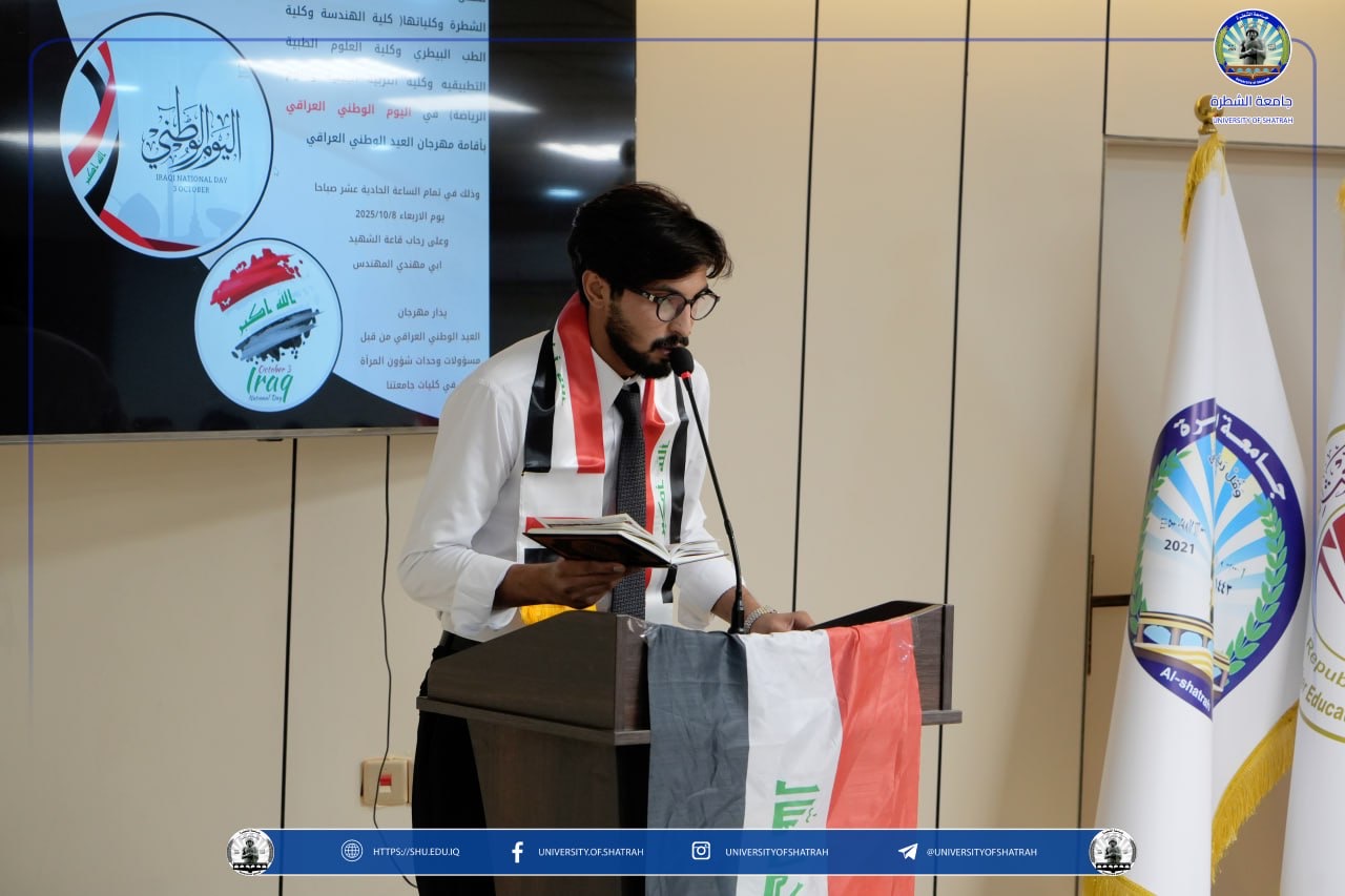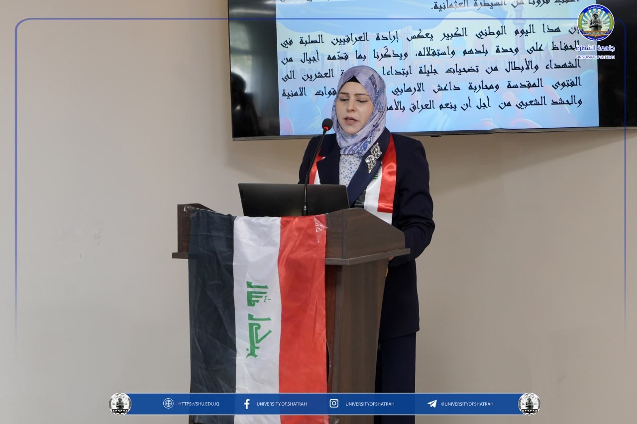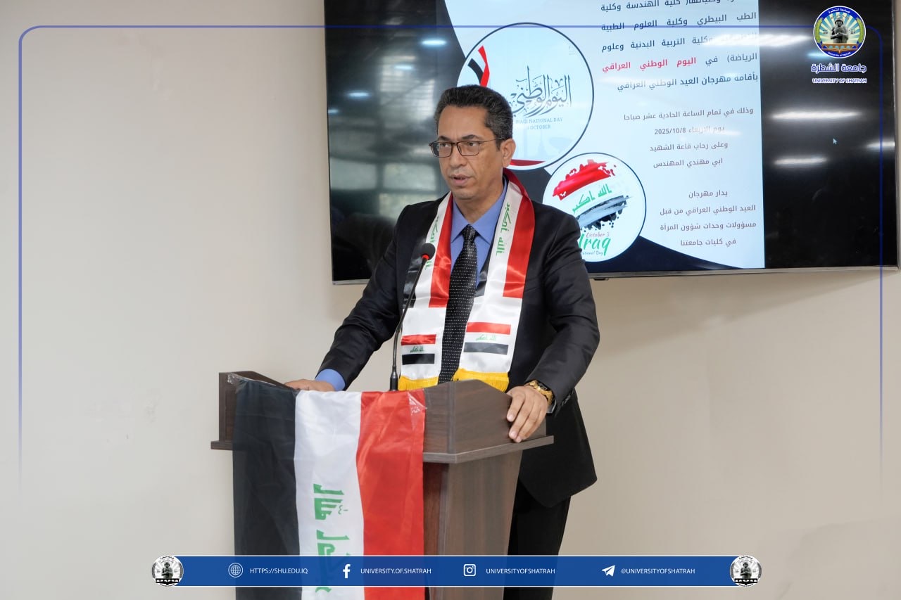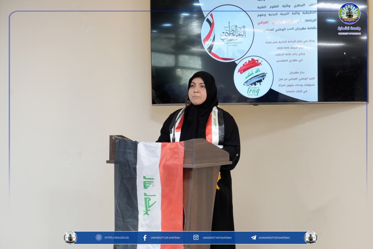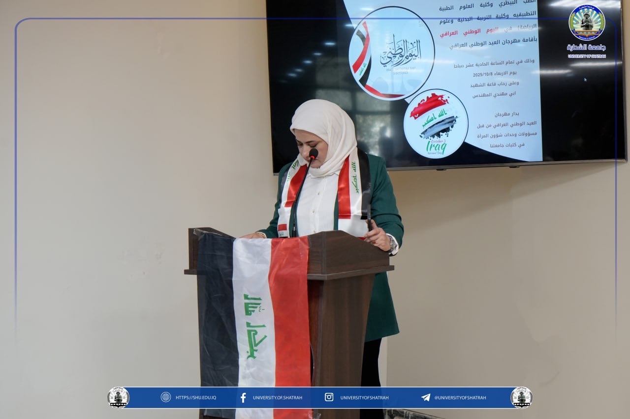 برعاية السيد رئيس جامعة الشطرة الأستاذ الدكتور باسم عبد الحسين جار الله، نظمت شعبة شؤون المرأة في رئاسة الجامعة وبالتعاون مع وحدات شؤون المرأة في كليات الهندسة، الطب البيطري، العلوم الطبية التطبيقية، التربية البدنية وعلوم الرياضة، والفنون الجميلة، مهرجانًا احتفاليًا بمناسبة العيد الوطني العراقي، اليوم الأربعاء 8 تشرين الأول 2025، على قاعة الشهيد أبو مهدي المهندس.